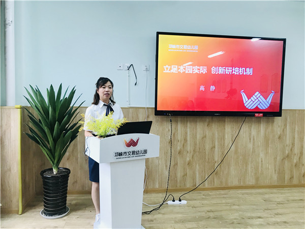园长高静以“立足本园实际,创新研培机制”为主题,分别介绍了文君幼儿园的园所文化和研培机制。分享了幼儿园在园务管理、教育教学、园本教科研方面的经验。