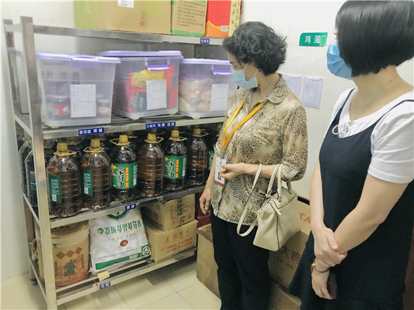 随后,督学一行来到厨房,对厨房的设施设备、物资存储情况进行检查。