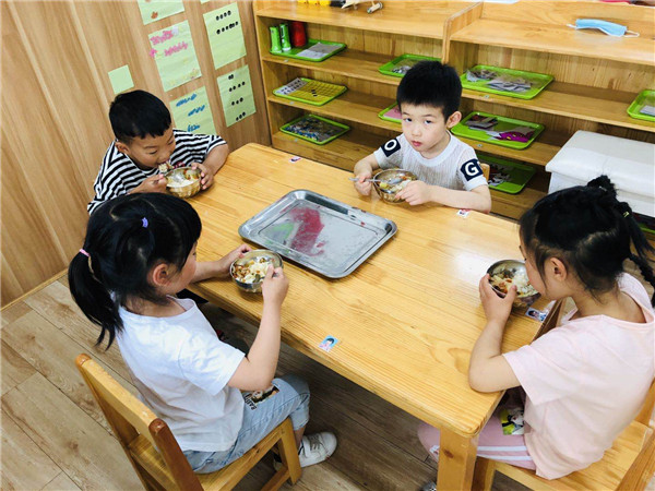 幼儿园一切活动皆课程,每个环节都渗透着教育。在进餐前,老师组织幼儿按照“七步洗手法”有序排队洗手。为了培养幼儿的自我服务意识及能力,孩子们自己排队取餐,到间隔一定距离,不拥挤;吃饭时做到安静用餐,不掉饭粒,保持桌面干净。