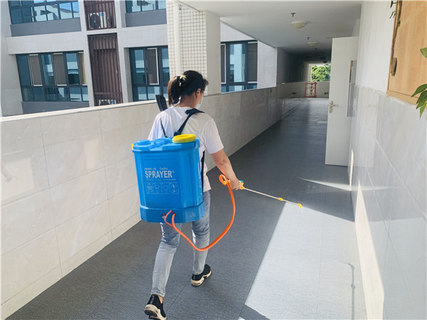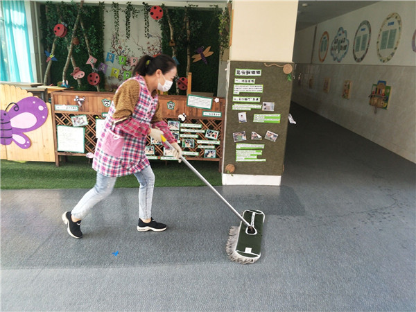 孩子离园后,老师们对幼儿园进行消毒,确保幼儿第二天的健康安全。
