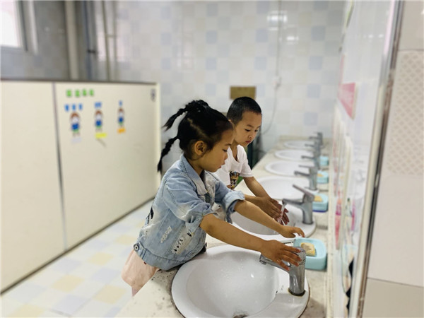 孩子们在老师的引领下,有序进行常规体检、洗手、入班、整理等事情。