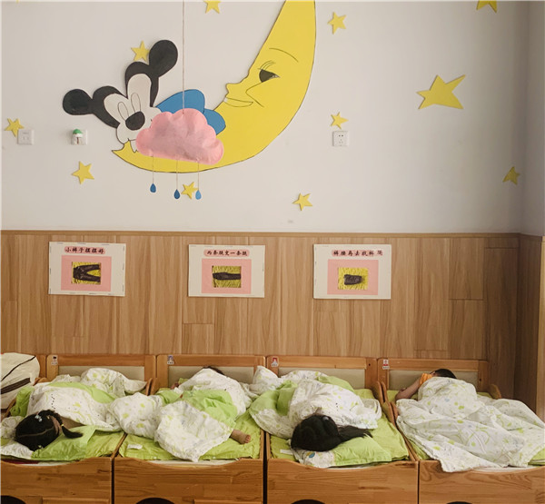 午睡前,老师给幼儿再次测温,体温正常的幼儿进入睡室安静入睡。