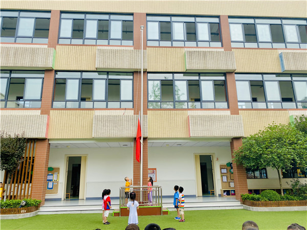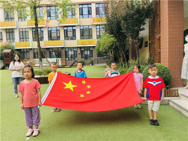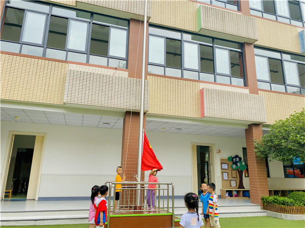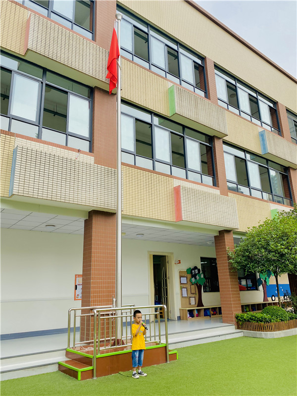 小小护旗手跟着音乐,举着五星红旗,踩着整齐的步伐、昂首挺胸地将国旗护送至旗台。