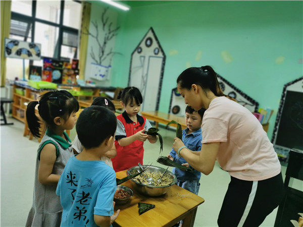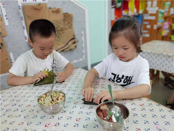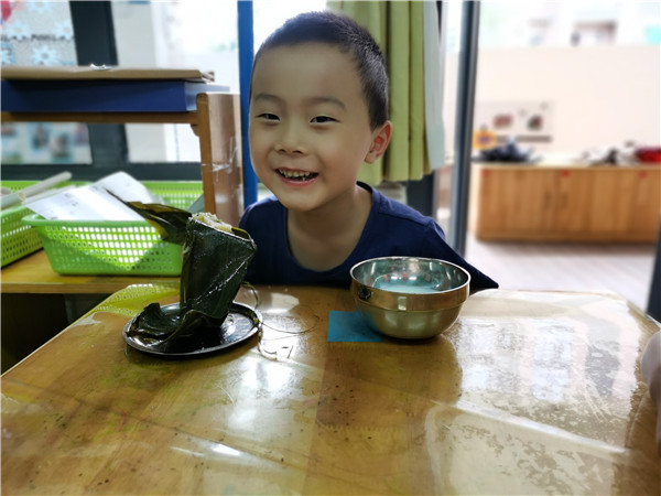 活动中幼儿们了解了端午节的来历与习俗,幼儿们用自己的方式来赛龙舟,编五彩绳。端午节当然少不了粽子,它们又叫“角黍”、“粽籺”、“筒粽”, 端午节吃粽子,这是中国人民的又一传统习俗,幼儿们在老师的带领下,认真地学习包粽子的方法。幼儿们自己包好粽子以后,由厨师煮好了让幼儿品尝,同时小朋友们也把粽子送给园长妈妈、保安叔叔、保健医生和老师们品尝。