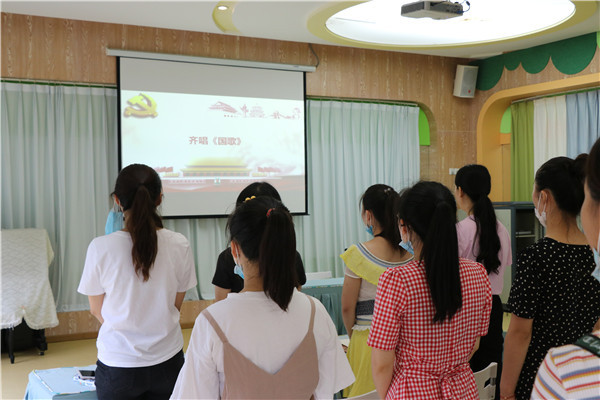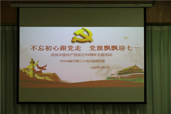 从嘉兴南湖红船上扬帆起航,到如今新时代不忘初心乘风破浪,中国共产党走过了99年光辉历程。为隆重纪念中国共产党成立99周年,进一步加强党组织和党员队伍建设,全面落实新时代党的建设总要求。2020年7月1日,成都市第三十幼儿园(以下简称:三十幼)全体教职员工共聚一堂,举行以“不忘初心跟党走党旗飘飘迎七一”为主题的“七一”庆祝活动。活动在庄严的《国歌》声中拉开帷幕。