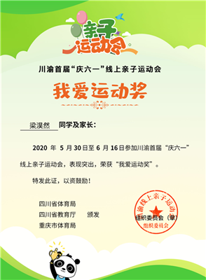 近日,由国家体育总局青少司指导,四川省体育局、四川省教育厅、重庆市体育局联合主办的川渝首届“庆六一”线上亲子运动会完美收官,本次运动会共吸引了川渝两地1732所小学和幼儿园参加,成都教科院附属幼儿园在四川省一千余所幼儿园中荣获“一等奖”。