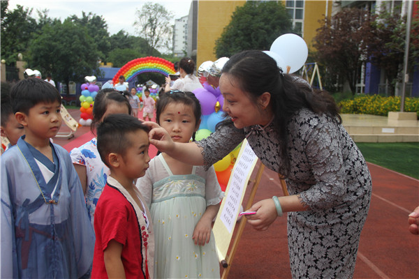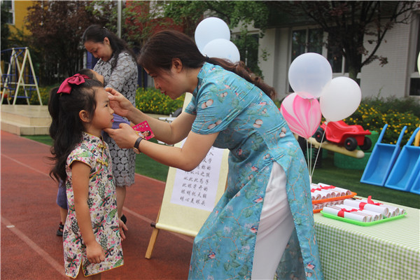 朱砂启智,园长妈妈为孩子们点朱砂,俗称开天眼。寓意着祝福孩子从此眼明,心明,好读书、读好书,在孩子们额头上点红痣,意为开启智慧,孩子们的人生定将绽放光彩。