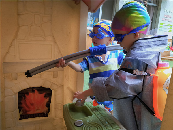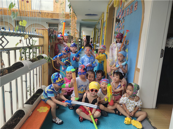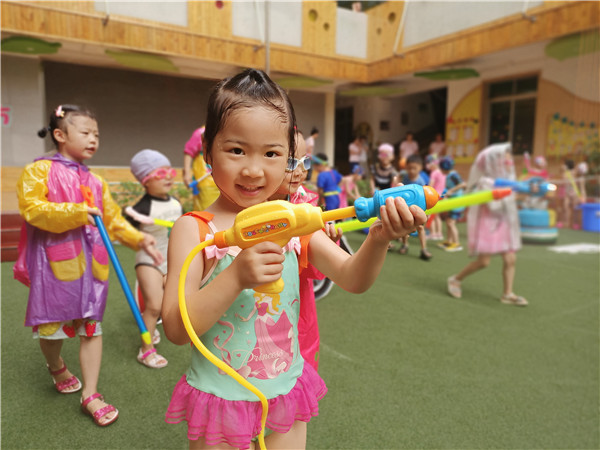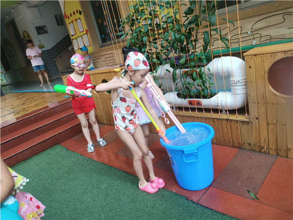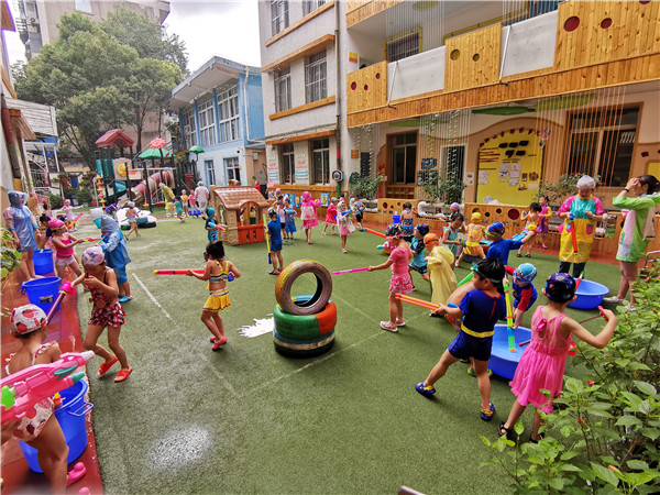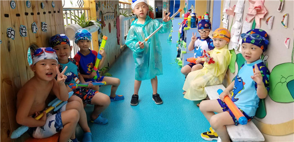 小朋友们一个个换好衣服、手持水枪,兴奋地来到操场上,准备开始一场“水的欢乐会”。