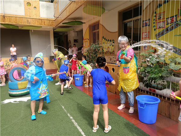 此次活动家长们积极配合,给孩子准备了换洗的衣物,水枪。老师们作了充分的准备,提前为大家准备好了器具盛水。加以装饰的操场,摇身成了一个“打水仗战场”。