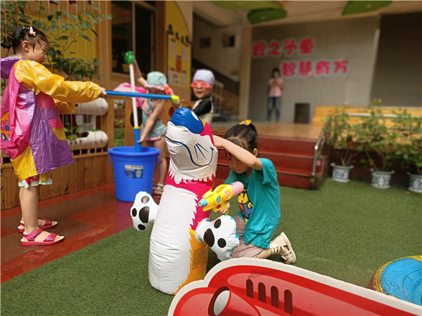 在炎炎夏日感受水的清凉,十九幼的老师们精心组织开展了“清凉一夏,水花飞舞打水仗”系列游戏活动,让孩子们体验水的清凉和夏季生活独有的快乐。