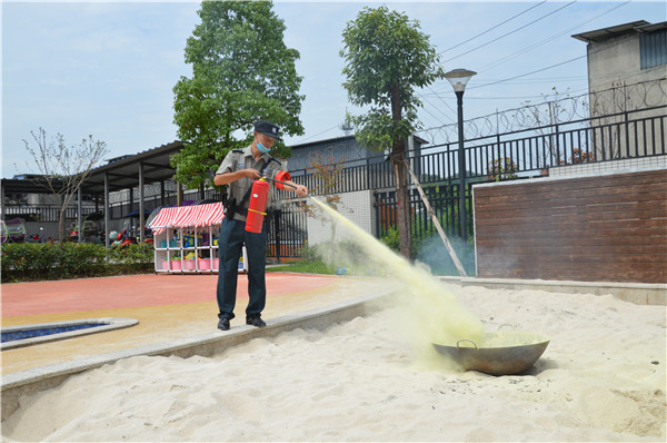 首先,园长苏莉带领安全小组成员对幼儿园消防监测设备、消防物资、电器线路等进行了全面、细致的排查,排查中做到不漏一处,不留任何死角,对排查到的安全隐患做了详细记录,并采取果断措施,明确专人负责、限时整改;其次,幼儿园邀请了成都市利民消防宣传中心教官到园,结合近年来的火灾案例,就消防法律法规、消防器材使用、逃生自救的方法等方面进行了详细讲解;最后,随着警报铃声的响起,幼儿在班级老师的带领下用湿毛巾捂住口鼻,弯着腰井然有序地沿着安全疏散路线,迅速撤离到安全区域,同时灭火小组成员在组长的带领下迅速到达火灾现场进行全力扑救;除此之外各班还利用讲故事、情景模拟、讲解灭火器的使用方法、参观微型消防站等多种形式开展了以“消防”为主题的安全教育活动。