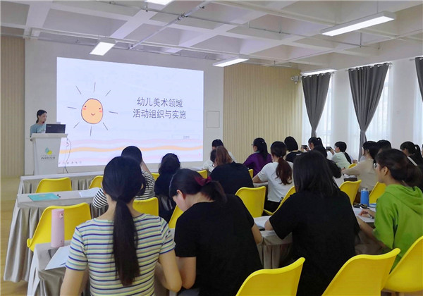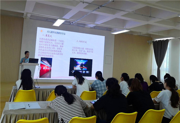幼儿园美术活动是艺术领域中的重要组成部分,美术活动作为一门视觉艺术和创造性艺术,对孩子的观察力和创造力的发展起着至关重要的作用。活动中教师严谨的组织和有效的指导,会直接影响幼儿各项能力的均衡发展。为了切实提高温江区政通幼儿园教师美术活动的教学组织能力,让其掌握正确的引导方法,温江区政通幼儿园于2020年7月17日,组织了一次由王思雨老师带来的《幼儿美术领域活动组织与指导》园本培训活动。