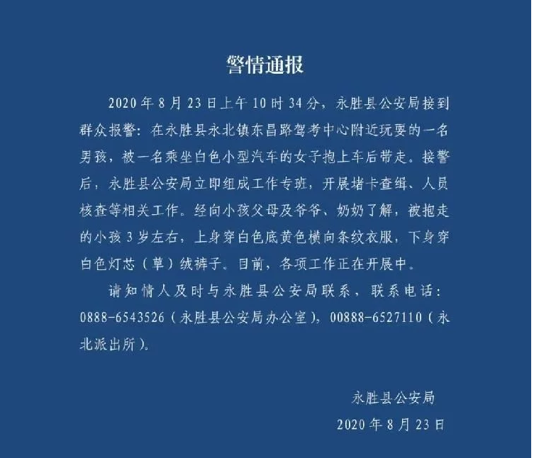 2020年8月23日上午10时34分,永胜县公安局接到群众报警:在永胜县永北镇东昌路驾考中心附近玩耍的一名男孩,被一名乘坐白色小型汽车的女子抱上车后带走。