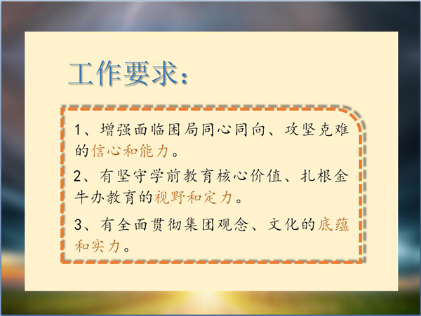 会上,杨园长首先指出,意识形态对于十七幼人“同心同向,共促幼儿园发展”的重大意义。借着传达金牛区教育局新学期工作会议精神的契机,杨园长为全体教职工讲解了金牛教育“建全国一流教育强区”的新目标以及目前所面临的四大严峻挑战,并强调“每次困难都是机遇、每所学校都是赛场、每个岗位都是先锋”,教师应该提高政治、业务和服务三大能力,在具体实践中勇于拼搏、攻坚克难。