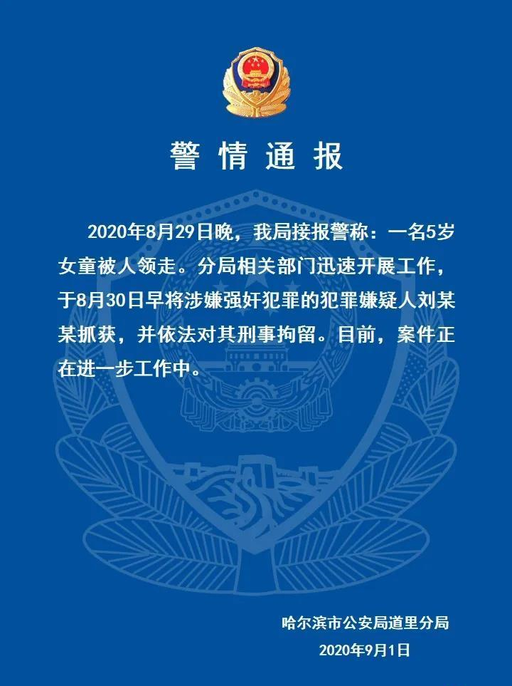 9月1日,据平安道里微警务消息,8月29日晚,我局接报警称:一名5岁女童被人领走。分局相关部门迅速开展工作,于8月30日早将涉嫌强奸犯罪的犯罪嫌疑人刘某某抓获,并依法对其刑事拘留。目前,案件正在进一步工作中。