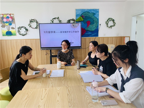 随后,陈督学在赵园长的陪同下,到会议室进行座谈交流。赵园长就幼儿园开学基本情况进行汇报,主要包括班级和教职工配备情况、核心文化、园本课程等方面。陈督学对全园教职工的服务意识和文化予以肯定,同时,对园本课程和课题实施、文化核心建设中“润心”文化的实施路径提出了建议和指导。