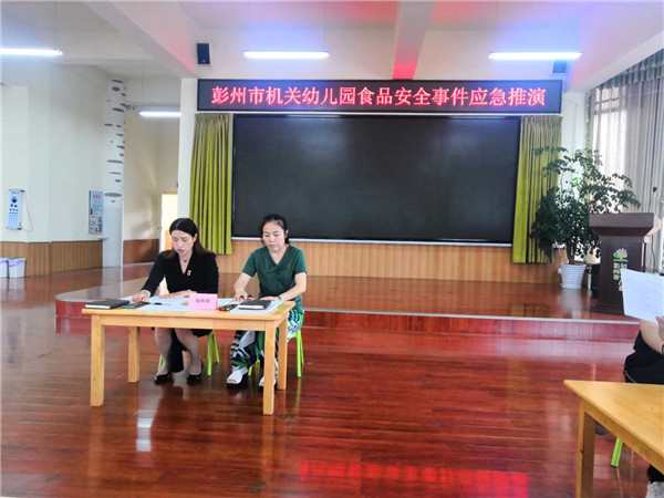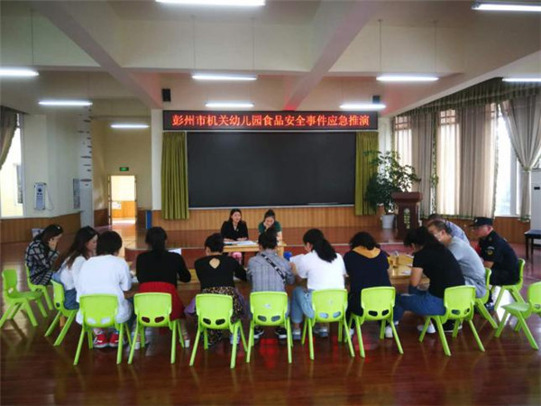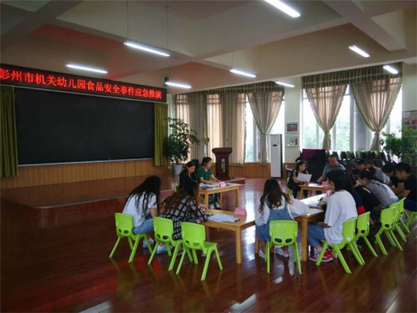 校园食品安全一直是校园安全管理的重点,在加强日常监管的同时,做好应急处理食品安全突发事件的准备和演练工作是非常有必要的。9月15日下午,彭州市机关幼儿园(以下简称:彭州机幼)主任陈安艳组织全体参演人员在机幼多功能厅有序进行了食品安全事件应急推演。