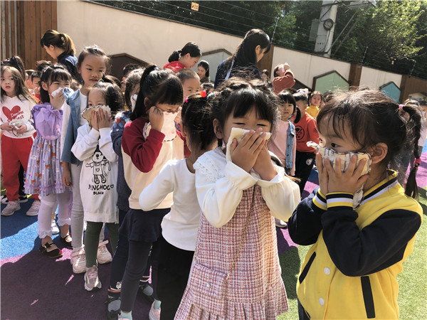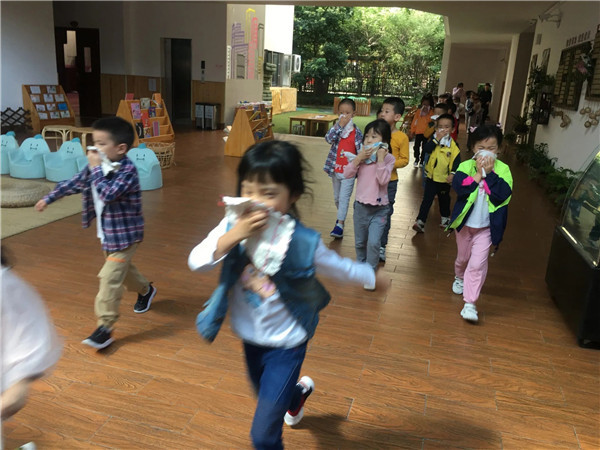 随后,演练开始。正值幼儿午睡起床,随着火警警报声响起,各班教师迅速做出反应,要求幼儿用湿毛巾捂住口鼻,弯腰、低头,有序地根据指定逃生路线快速撤离至安全区域。教师及时清点人数后进行上报,整个演练活动用时2分55秒。