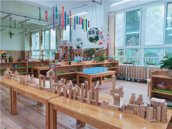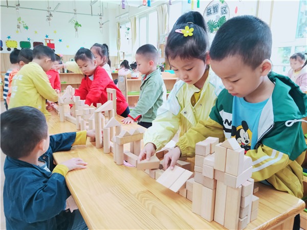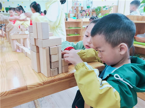 “老师,我们来搭一座长城吧!”“我想搭一座很长很长的长城”“那我们用什么来搭建呢?”“用玩具吧!”“老师,我们可以用积木!”于是,小朋友们开始搭建自己心中的“长城”,以此表达对祖国美好的期盼和向往。