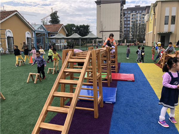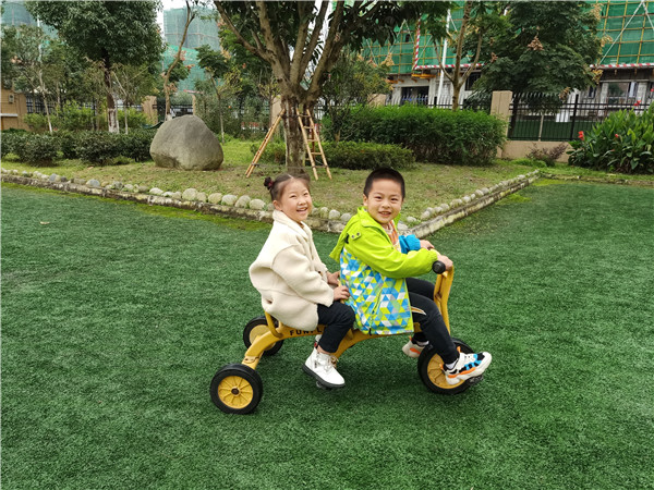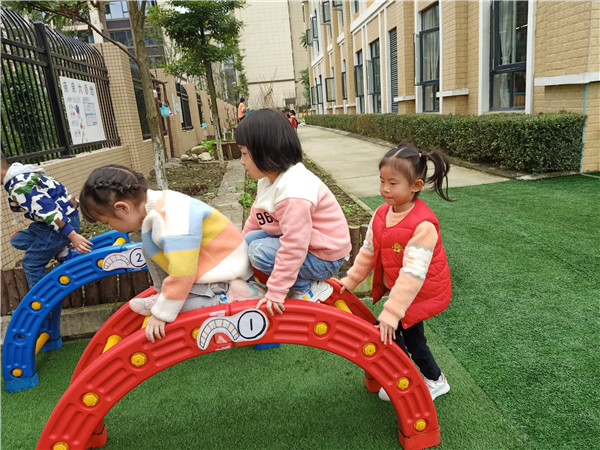 脚踩踏板,手抓扶柄,用力向前蹬,快乐骑行开始啦;排排队、做做操,踢踢腿、扭扭腰,坚持做操身体好;爬一爬、跳一跳,晨间大户外中洋溢着孩子们的欢笑声和加油声……