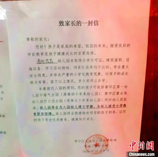 事情发生后,赛罕区无证幼儿园关停取缔领导小组办公室发布了《致家长一封信》。信中称,春田花花幼儿园未取得办学许可证,建筑面积、师资队伍等均不达标,存在重大安全隐患,责令其停止办学。