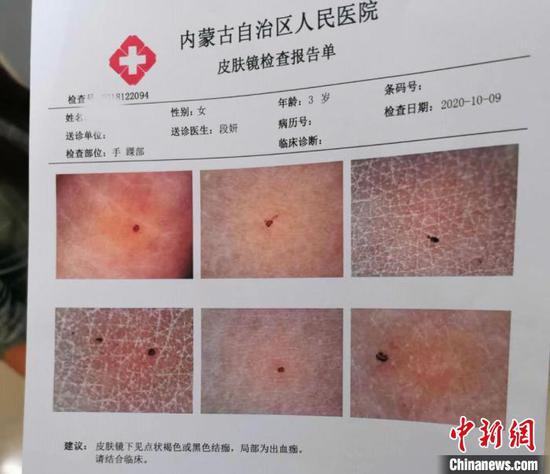 赵女士报警的同时带着孩子去医院作了鉴定。医院的报告单显示,皮肤镜下见点状褐色或黑色结痂,局部为出血痂。
