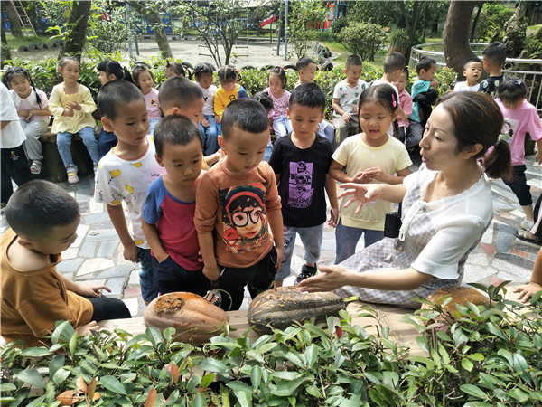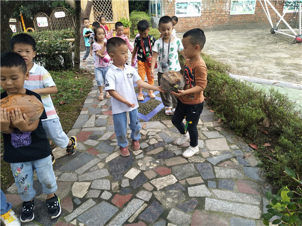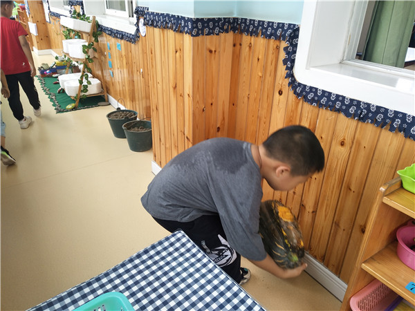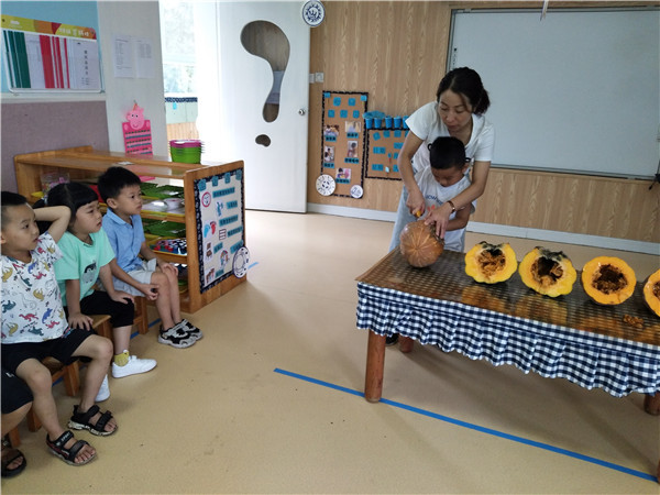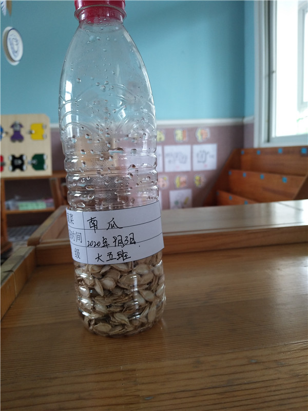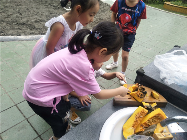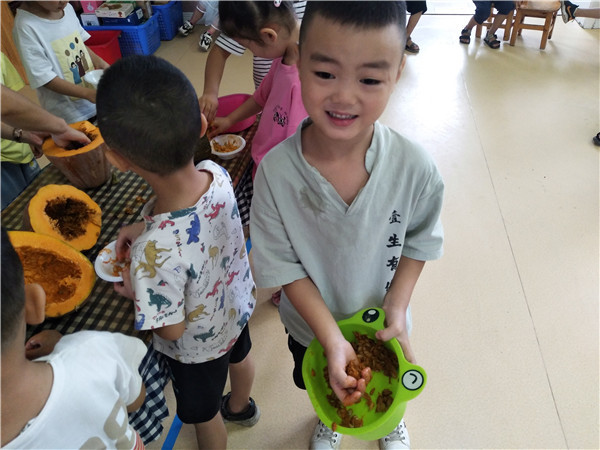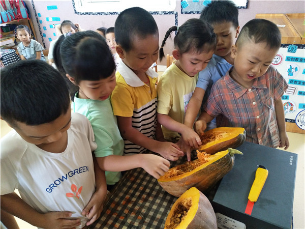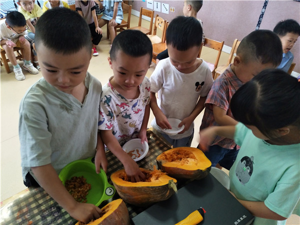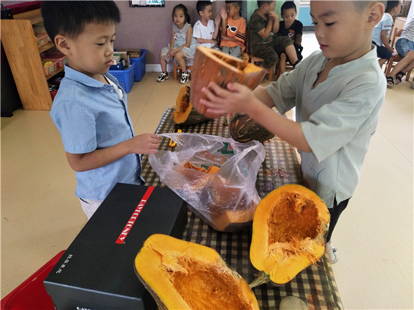 “不过它的籽还没有变色,可以掏出来明年再种!”小朋友们将南瓜籽晒干、装瓶。