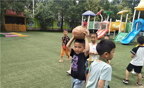 带着这些问题,大家决定把南瓜带回教室一探究竟,可是腐烂的南瓜怎么搬运呢?小朋友们各出“奇招”:把腐烂面朝上抱,这样才不会弄脏衣服;接力运南瓜;头顶运南瓜。
