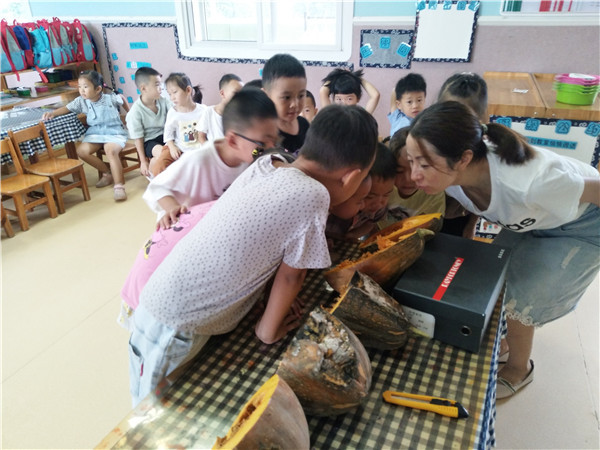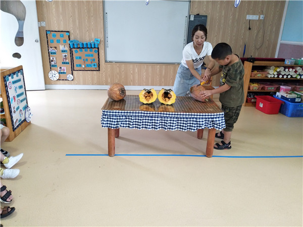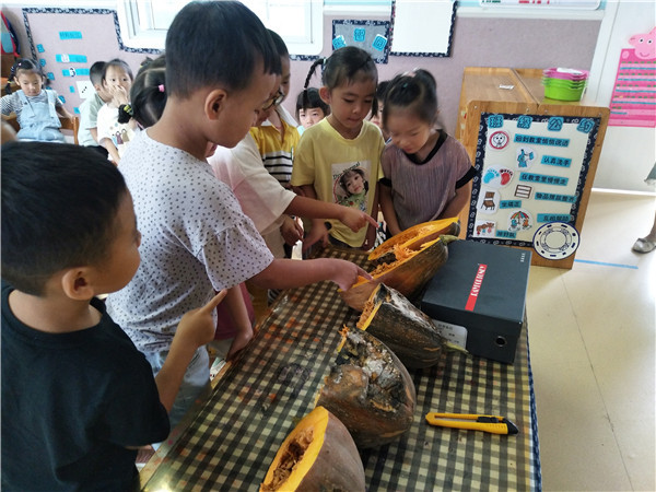 “不知道腐烂的南瓜是什么样的,会和我们想的一样吗?”周淼辉发出了疑问。于是小朋友们开始对南瓜进行“解剖”。他们把南瓜搬到活动室的桌面,老师准备小刀,小朋友们用横切和竖切的方式“解剖”南瓜。