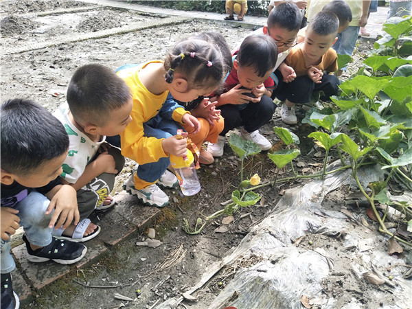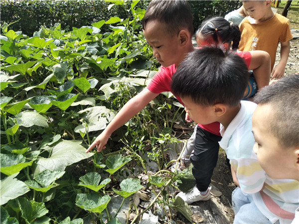 上学期,双流区黄水幼儿园白云分园的小朋友们在植物园种植了一棵南瓜,快放假时南瓜藤上结出了几个小南瓜。