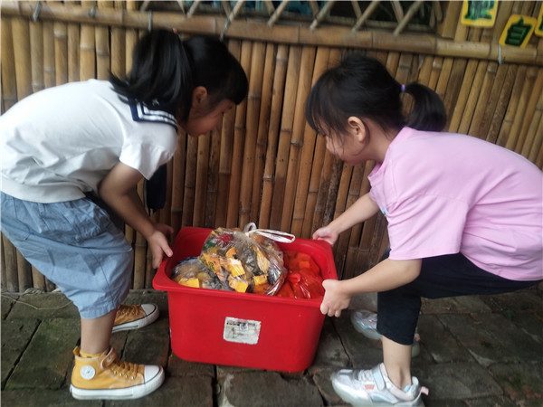 南瓜籽儿有了着落,那南瓜的肉怎么办呢?腐烂的南瓜是不能吃的,但是扔掉又很可惜,于是小朋友们决定用腐烂的南瓜做肥料,把南瓜搬到户外切块,装入塑料袋,搬运到木房子后再放到密封箱。