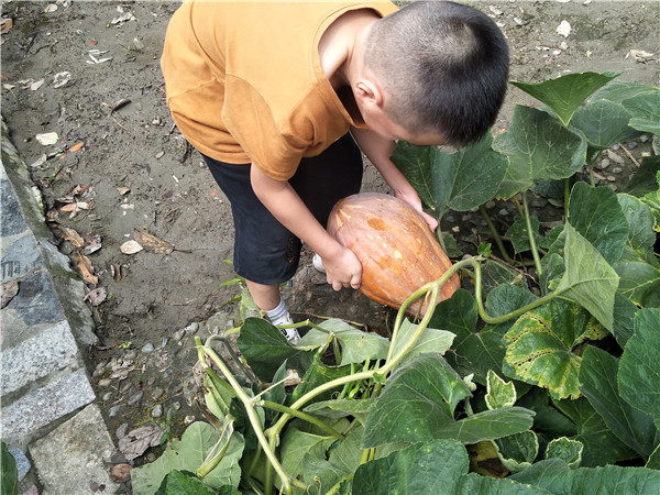 看着变黄的南瓜,小朋友们开始问:“老师,南瓜变黄了我们把它摘回去吧!”说着,小朋友就开始摘南瓜了。不过,在摘下南瓜的那刻,孩子们发现了问题:接触地面的那面南瓜有点腐烂了。