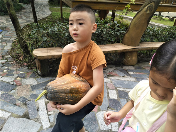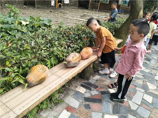 开学第一天,小朋友们来到植物园时惊喜的发现南瓜变黄了。周智豪双手抱着变黄的南瓜说:“哇,老师,我们的南瓜长的好大呀,我都快抱不动它了。”