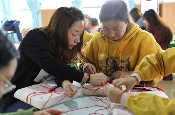 在正式体验传统绳结编制前,非遗传承人杨老师从绳结的历史、绳结编制的种类等方面向幼儿园教师介绍了中国传统绳结编制手工技艺。制作和体验活动选择了蝴蝶挂饰作为教学范本,杨老师说:“蝴蝶谐音福迭,寓意福气重重迭迭连绵不尽之意”。编制过程比较复杂,教师们都专心致志地学习,在过程中遇到困难,杨老师和他的团队导师都耐心地指导。最后在老师帮助下,全体幼儿园教师都完成了一个个精美的蝴蝶绳结编制作品。