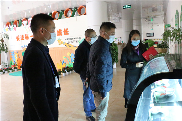 高文书记一行在郭园长的陪同下重点视察了幼儿园食堂食品安全管理情况、校园安防设施建设、疫情防控等工作。视察过程中,高书记对幼儿园食堂人员管理、食品溯源、食品加工制作管理、清洗消毒等方面进行了询问,还仔细查看了食堂送货人员体温表、厨房人员一日三查表、幼儿食品试尝记录表,对幼儿园食堂的细致工作给予了高度的赞扬。安全科长何剑更是深入食堂操作间内部,实地察看了食堂各个环节的操作区域,对幼儿园的食堂设备设施和食材情况进行检查,并对食品库房内干杂的进货日期、保质期标注问题提出了指导意见。