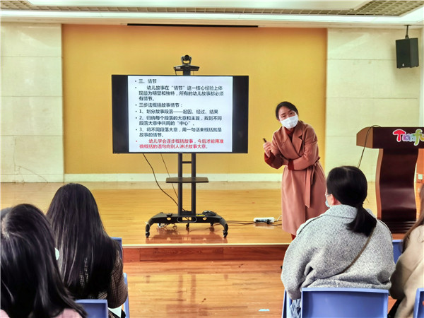 随后,毛芳芳园长以故事教学为例,从如何筛选故事、幼儿故事学习的核心经验分析、分析幼儿故事学习中的核心经验层次关系技巧、幼儿故事学习活动的组织与教学策略等方面,用鲜活的案例,深入浅出的为学员讲解了语言活动的设计与实施。