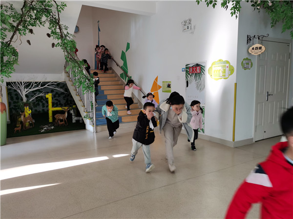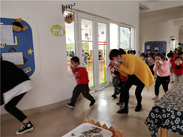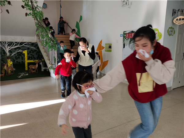 “为什么会有这个声音?着火了吗?着火了!着火了!我们赶紧逃跑吧!”随着警报声的响起,各班教师快速、有序地依据疏散路线带领幼儿捂住口鼻、弯下身体,有序地疏散到指定地点。