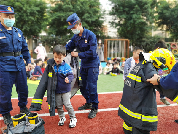 在确认全园幼儿及教职工安全撤离后,消防员为小朋友们展示常用消防器材及服装,孩子们在消防员叔叔的帮助下,体验穿戴消防员服装。