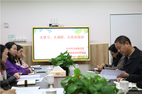 2020年11月12日上午,彭州市教育局党组书记、局长周权同志,市教育局人事与教师工作科、市教育局学前与终身教育科、市教育局新建学校筹备办等科室负责同志一行6人到彭州市实验幼儿园(以下简称:彭州实幼)开展“大学习、大调研、大走访”活动。彭州市实验幼儿园行政团队成员、彭州市南部新城学校筹备组成员参加了此次调研活动。