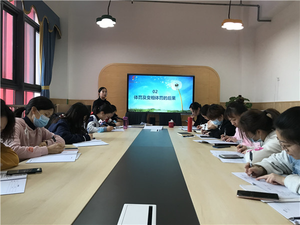活动开始,教育教学部刘敏老师带领大家重温《新时代幼儿园教师职业行为十项准则》和《幼儿园教师违反职业道德行为处理办法》,进一步增强教师的责任感、使命感、荣誉感,规范职业行为,明确师德底线。并通过真实案例,让老师们知道体罚及变相体罚给孩子及家庭、幼儿园、教师三方面带来的危害,在培训中全体教职工一起朗读“幼儿园教师专业用语100句”,并要求将其运用到实际生活中。