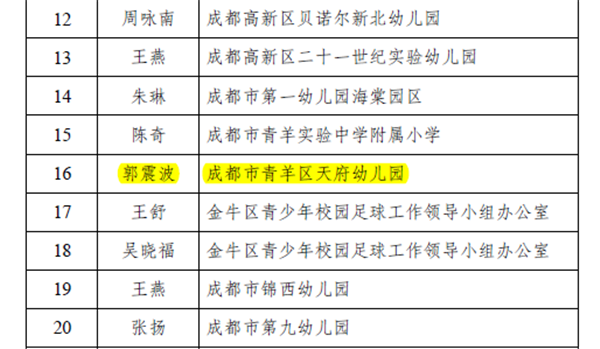 近日,成都市教育局、成都市青少年校园足球工作领导小组公布了2019年成都市青少年校园足球优秀单位和个人、成都市首届校园足球(幼儿足球)专家委员会成员名单。成都市青羊区天府幼儿园荣获“幼儿足球优秀幼儿园”称号,教务主任郭震波被遴选为成都市首届校园足球(幼儿足球)专家委员会成员。