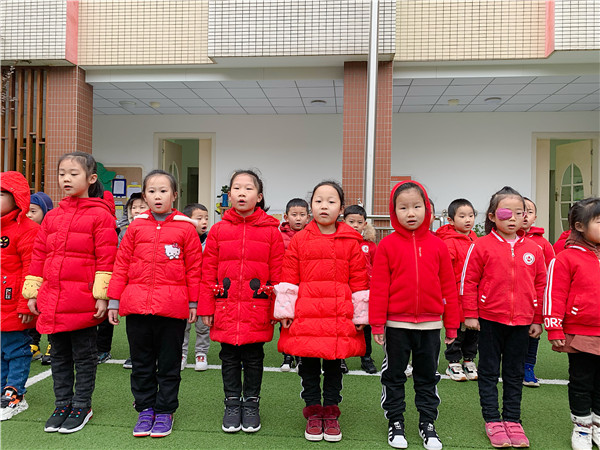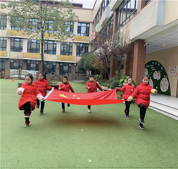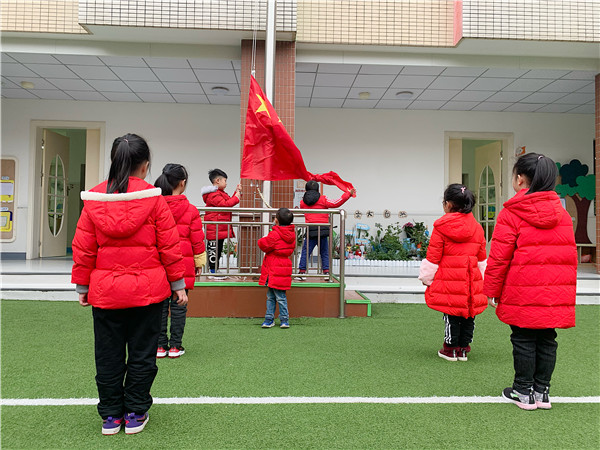 随着胡敏浩小主持清脆响亮的口号,吴忠麒、邓昊轩两位升旗手和黄意轩、唐子翾、杨羽馨、肖恩眷四位护旗手迎着朝阳、踏着整齐地步伐,精神抖擞、阔步入场,振奋人心的《义勇军进行曲》嘹亮地响起,五星红旗冉冉升起。全体师幼齐唱国歌,行注目礼。