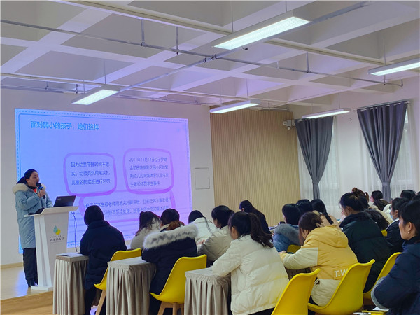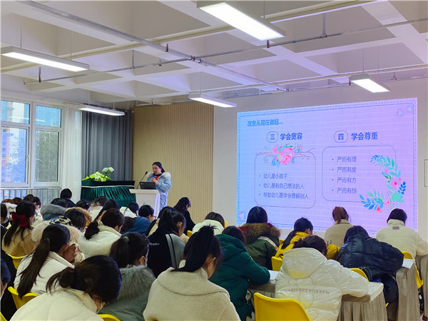 为进一步加强全校教师职业道德建设,展示广大教师爱岗敬业、无私奉献的精神风貌,提升教师队伍整体形象以及思想政治素质、职业道德水平,使每位教师做到立德树人,立德修身,内铸师魂,外塑师表,成为有爱心、有责任心的优秀教师。2020年12月8日下午,温江区政通幼儿园执行园长万慧为全体教职工带来题为《承“融”文化核心 育“三自”儿童》的师德师风专题培训活动。