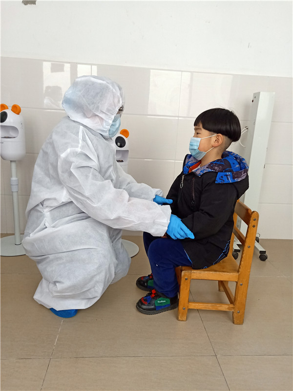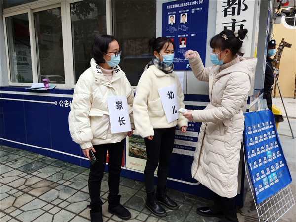 家长与幼儿佩戴好口罩站在大门外,保持一米距离等待入园,老师在门口负责依次接待幼儿、检查健康码、测量体温并发放临时接送卡,其中一名幼儿用电子体温计测量体温显示发热,老师立即询问家长孩子身体情况,并用水银温度计进行二次测量温度为38℃,立即通知家长带到公立医院发热门诊进行检查,检查结果出来后,立即告知老师及保健室做好登记和病情追踪,并向校领导进行汇报。
