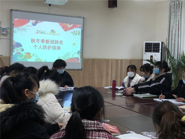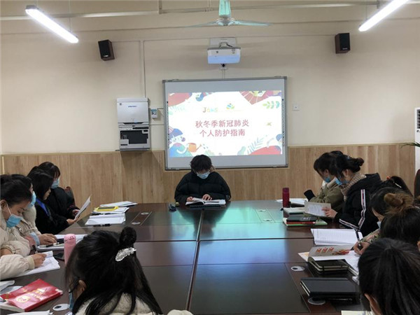 为切实提高对新冠肺炎疫情的防控能力,宣传普及传染病防治知识,保障全体师幼的健康与安全,2020年12月3日,双流区金桥红石幼儿园组织教职工进行了“秋冬季新冠肺炎居民防护指南”培训。