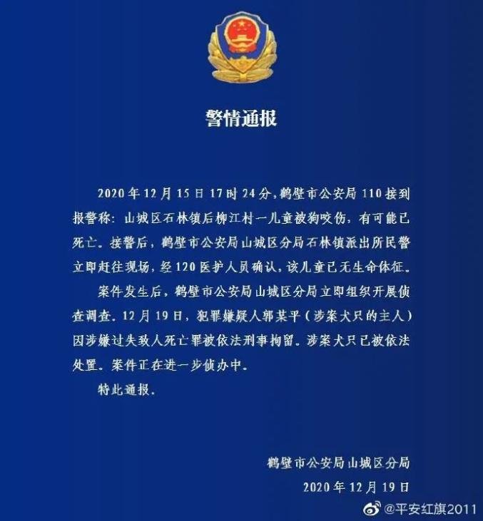 12月20日,鹤壁市公安局山城分局发布通报称,狗的主人郭某平因涉嫌过失致人死亡罪被依法刑事拘留。
