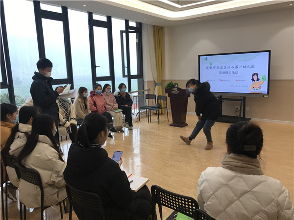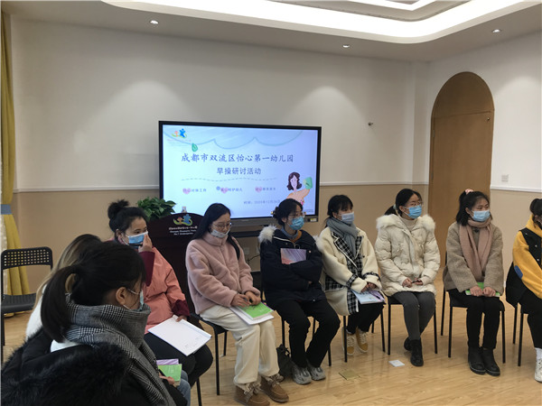 2020年12月28日,双流区怡心第一幼儿园举行早操研讨活动。体智能教师石胤豪围绕《幼儿园教育指导纲要》对早操在幼儿园一日活动中的必要性以及早操的编排步骤与注意事项进行了系统的阐述。