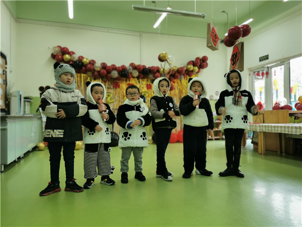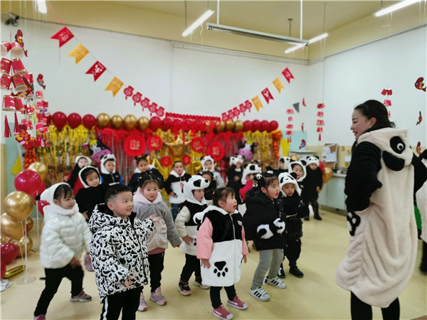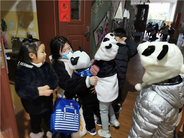 一大早,老师们身穿熊猫服饰在幼儿园大门口用独特可爱、喜庆有趣的方式喜迎同样佩戴熊猫饰品的小朋友们,热情拥抱,道上一句:“红红火火,happy牛year!”