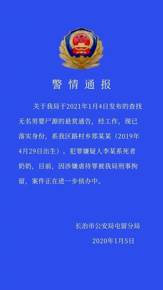 1月5日,屯留警方发布通报称,犯罪嫌疑人李某系死者奶奶。