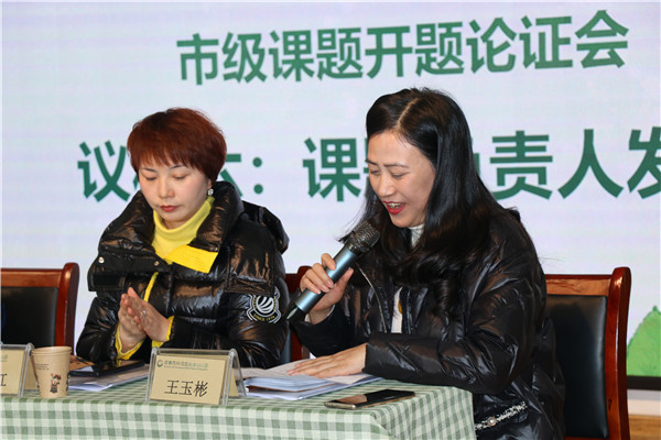 科研室主任杨晓利作开题报告,主要围绕该课题的研究背景、研究目的和内容、研究思路和研究措施等方面进行了详细的阐述。